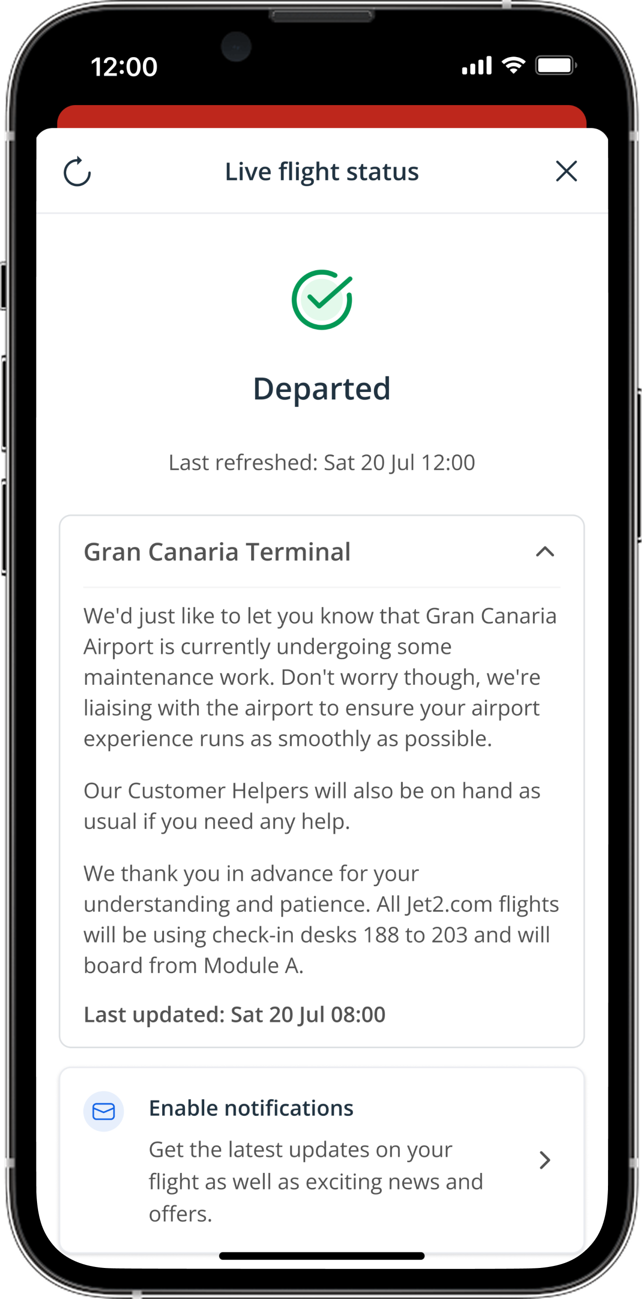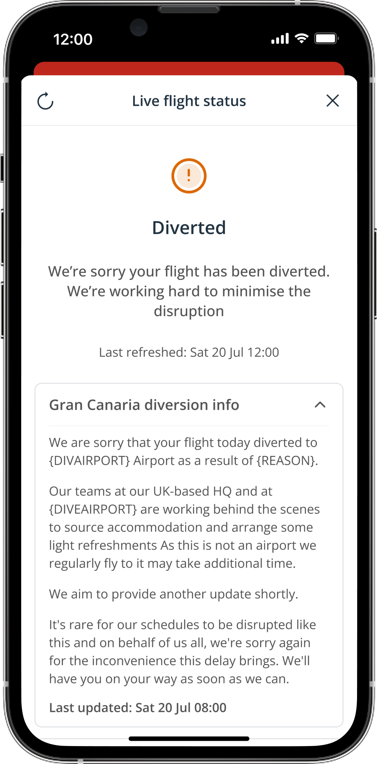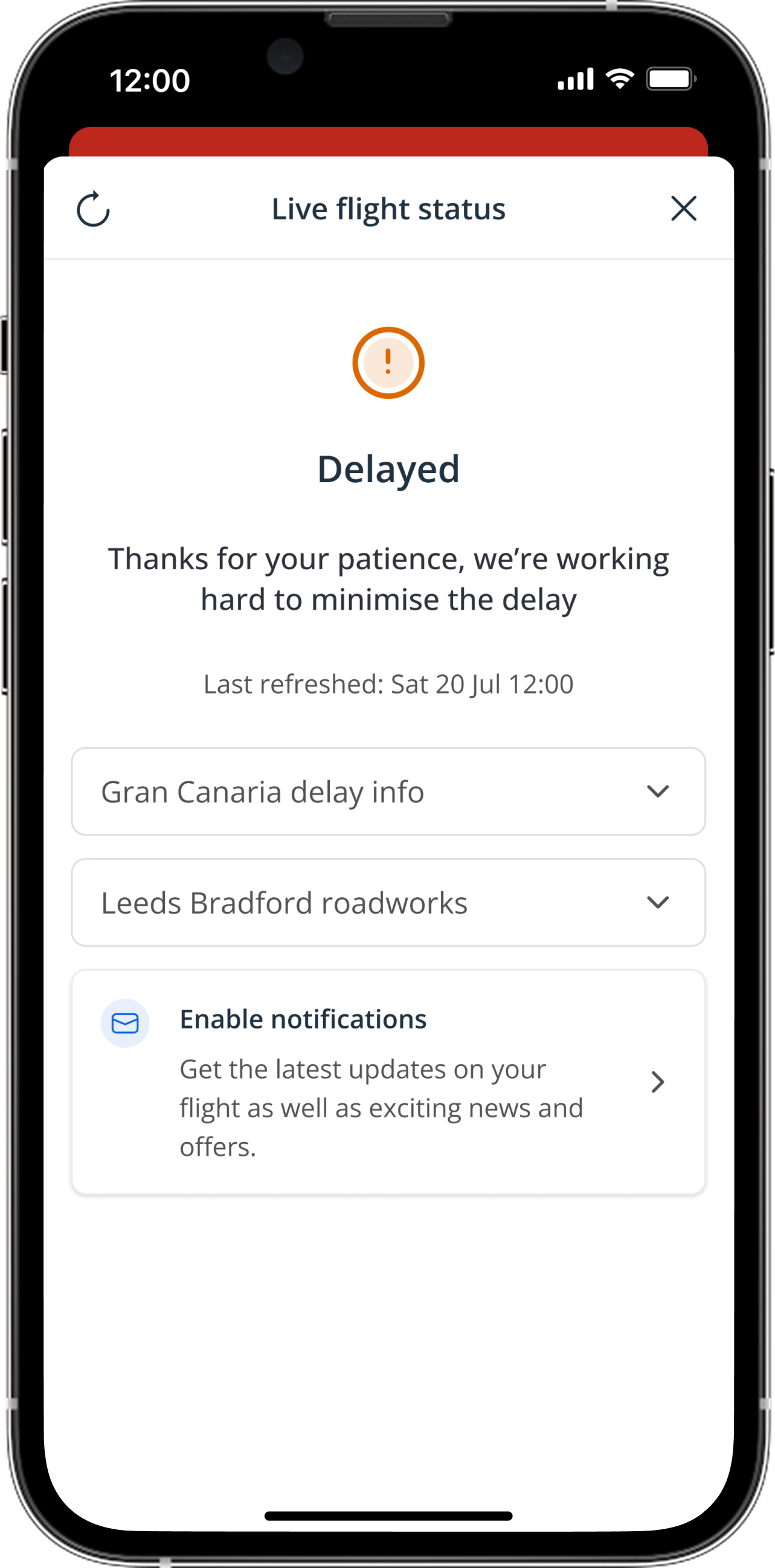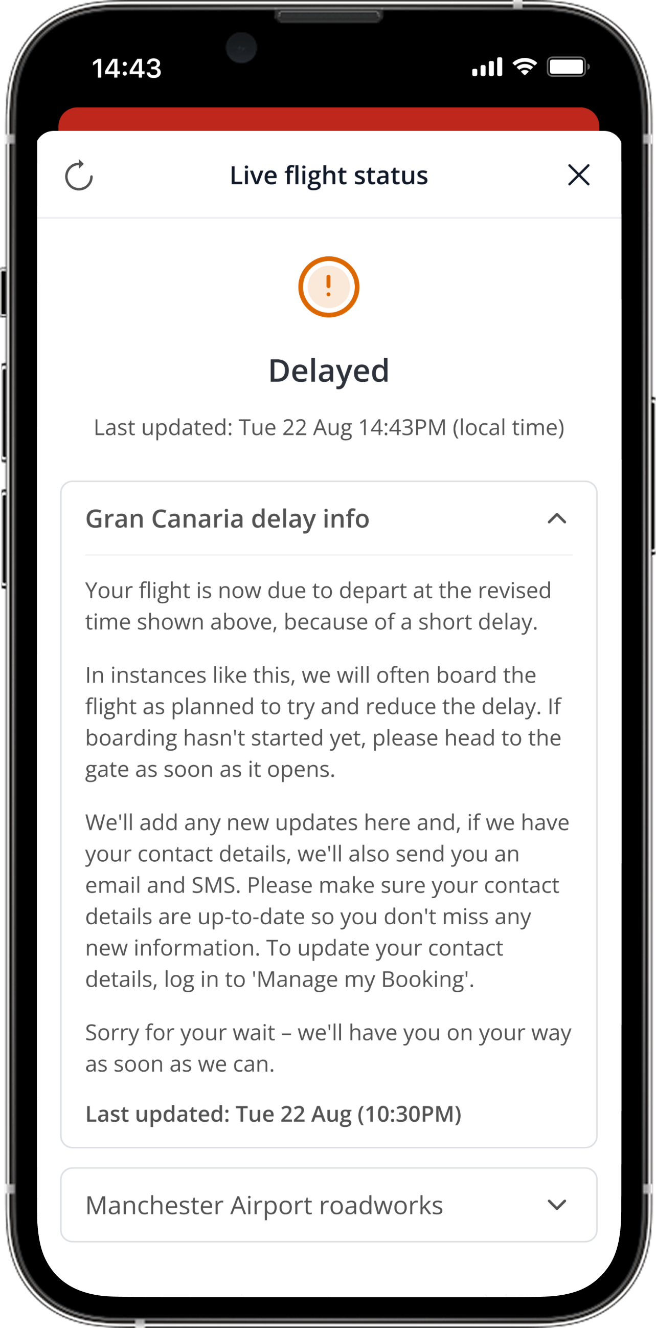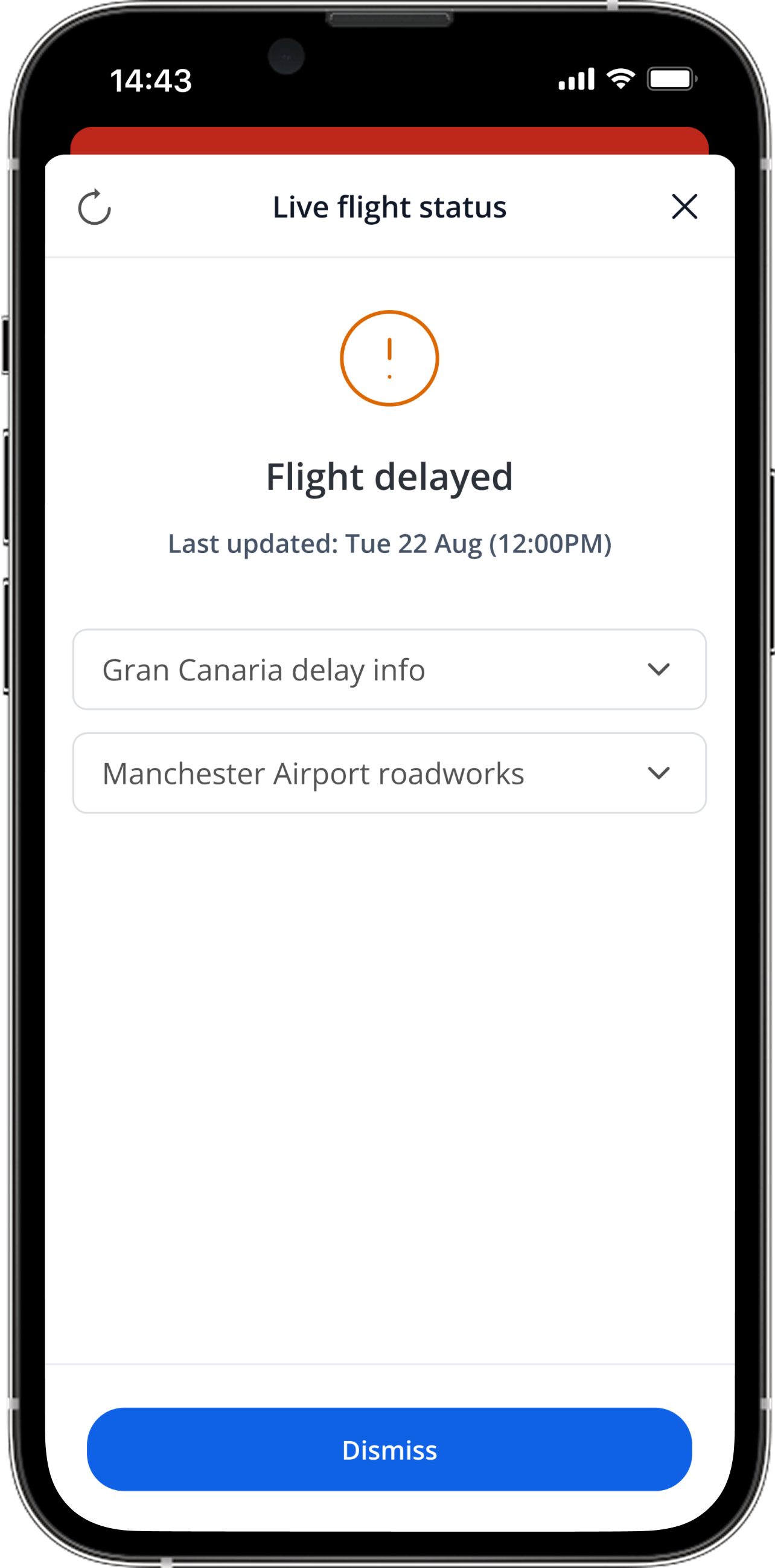 This option keeps the “More info” CTA but opens a bottom sheet with flight updates. It accommodates longer text and is more noticeable, but multiple messages (e.g. roadworks plus a flight delay) may need to be shown together in the modal.