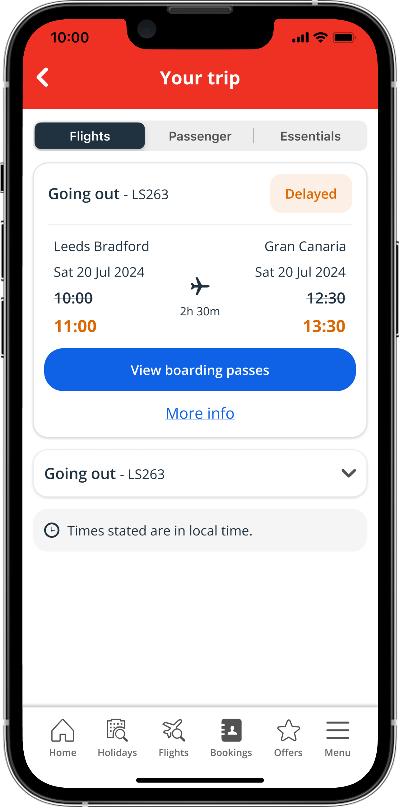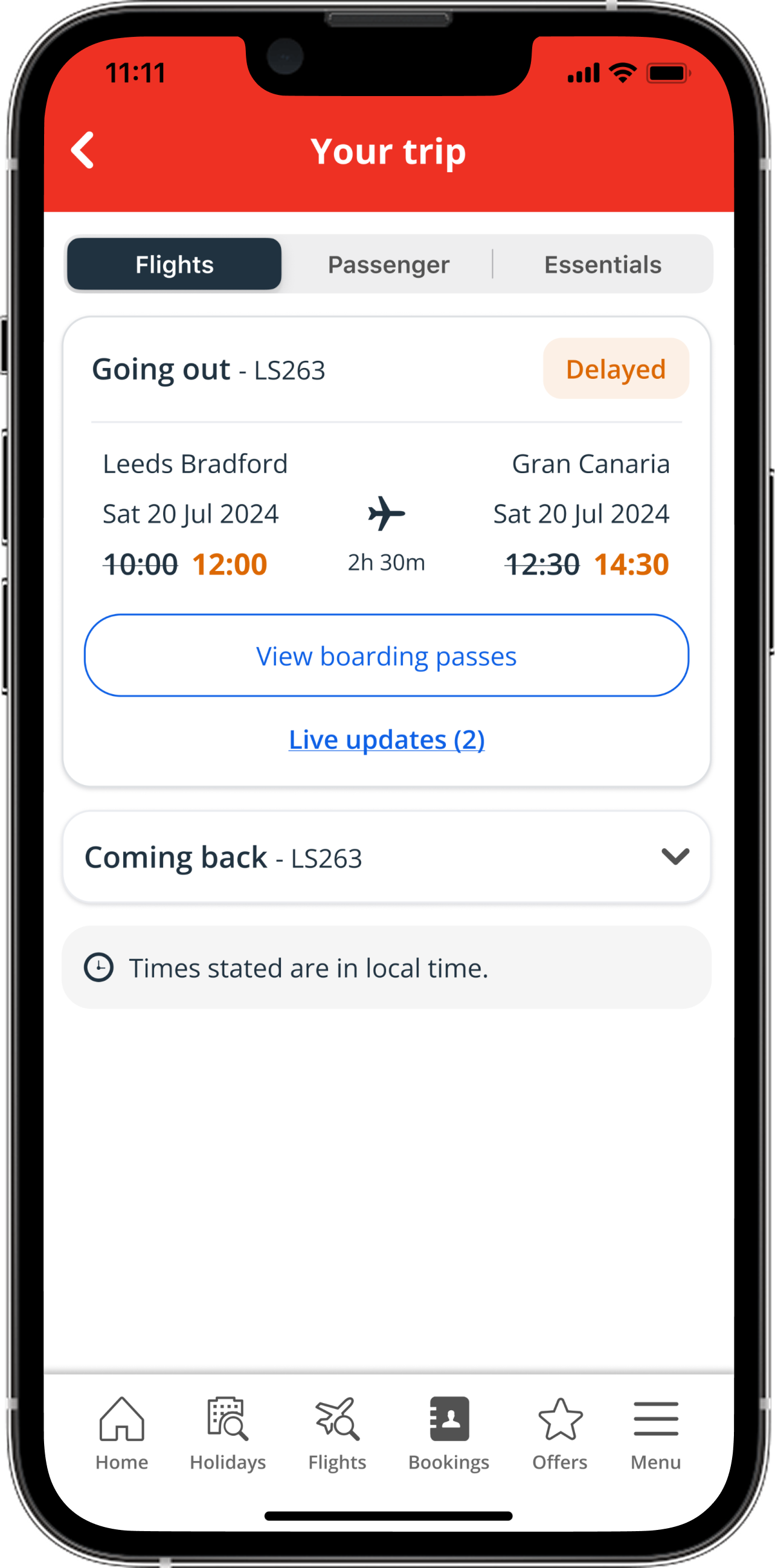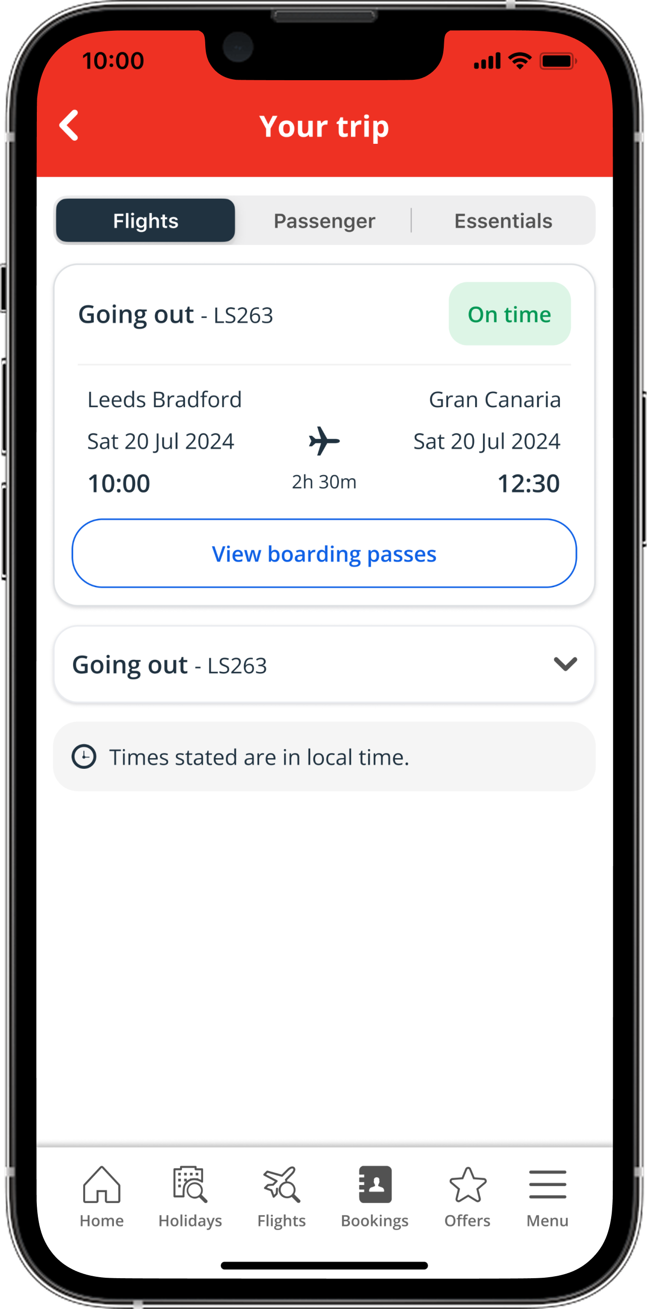 Users can access this page from the saved booking or flight page on travel day, as well as other touchpoints like the homepage or side menu.
