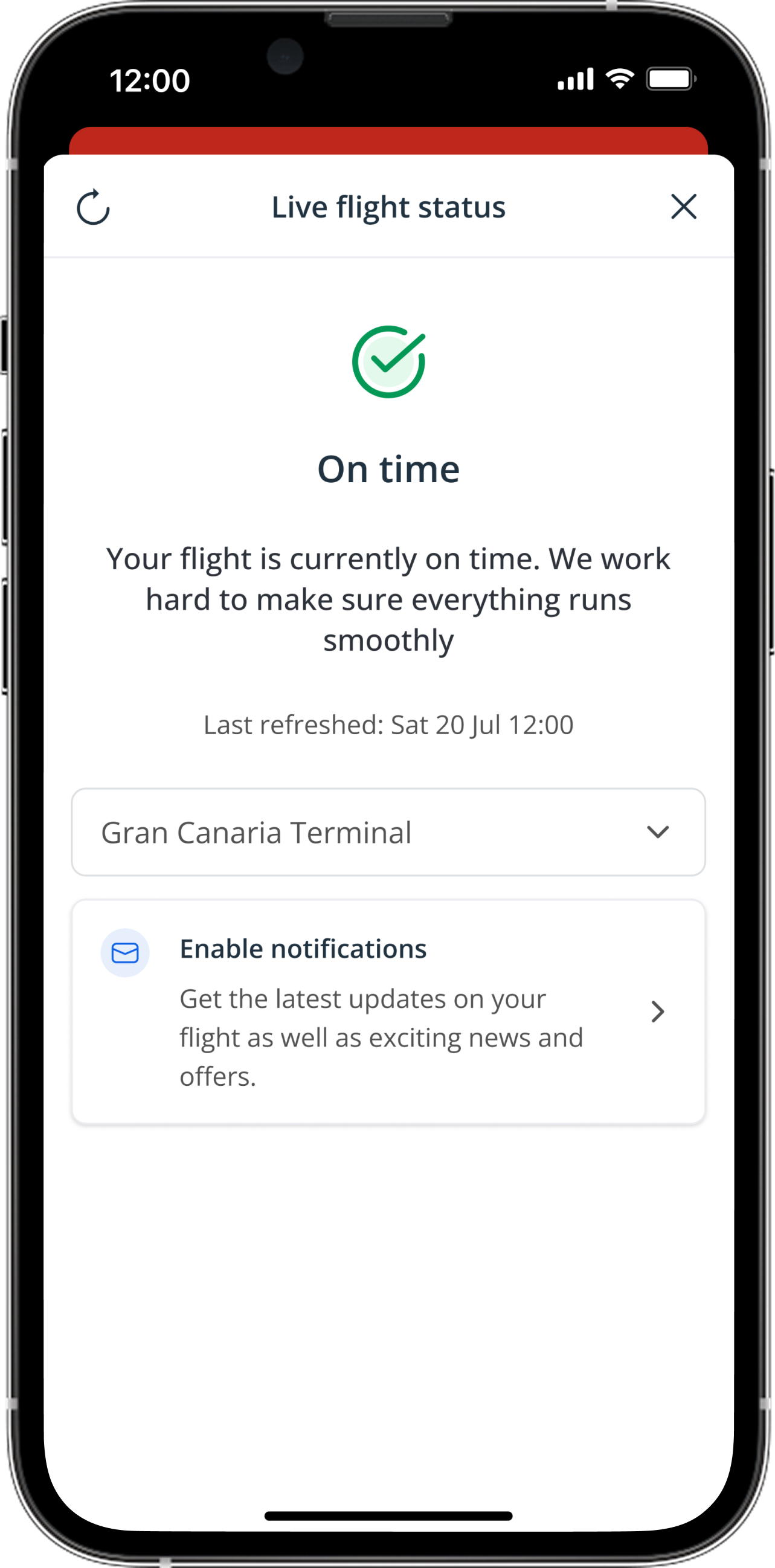 The on time status will be used to show customers that their flight should depart and arrive according to its scheduled times. The app will start calling the API 2 hours before departure.