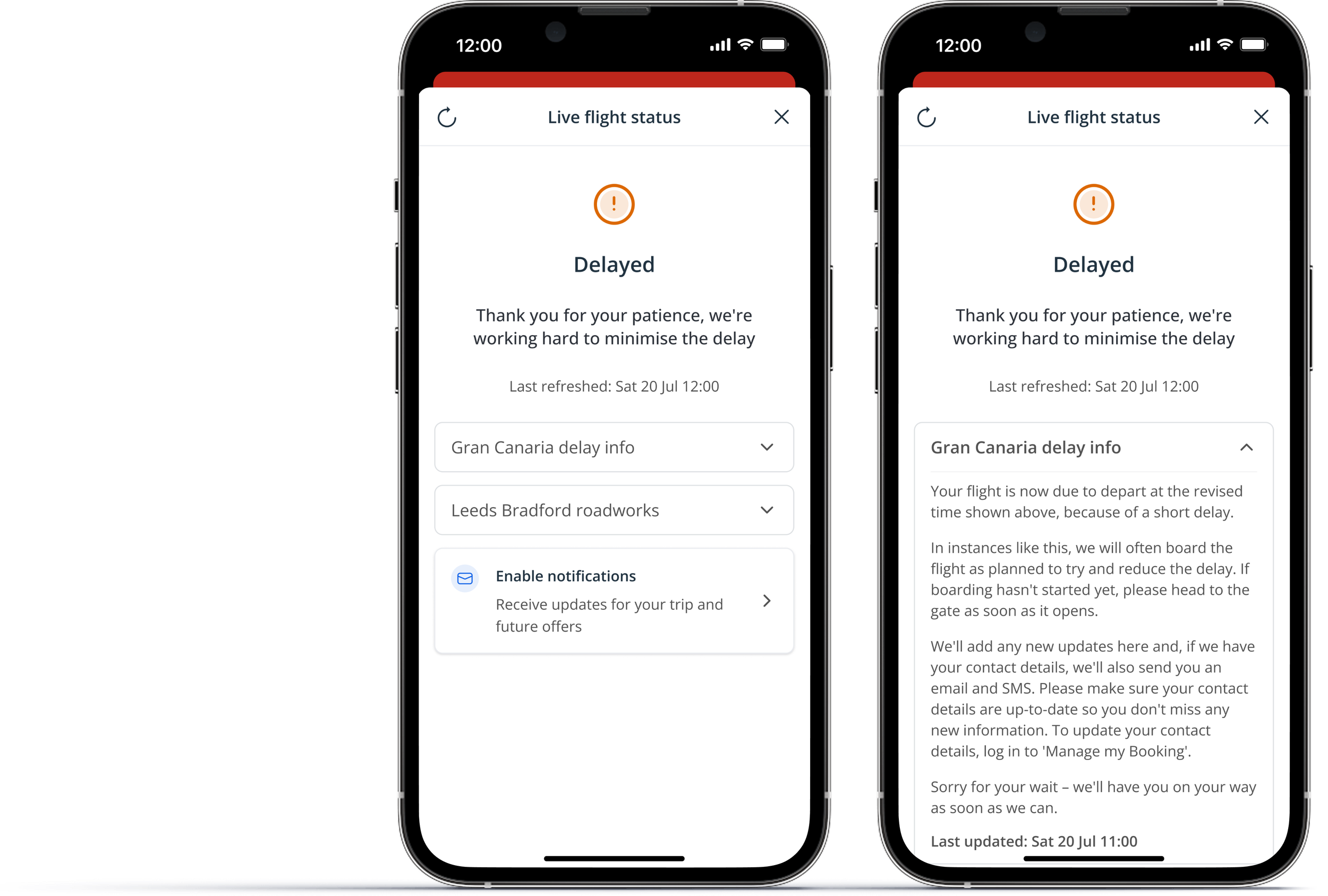 Users are easily accessing additional flight updates via “More info” CTA on both designs.